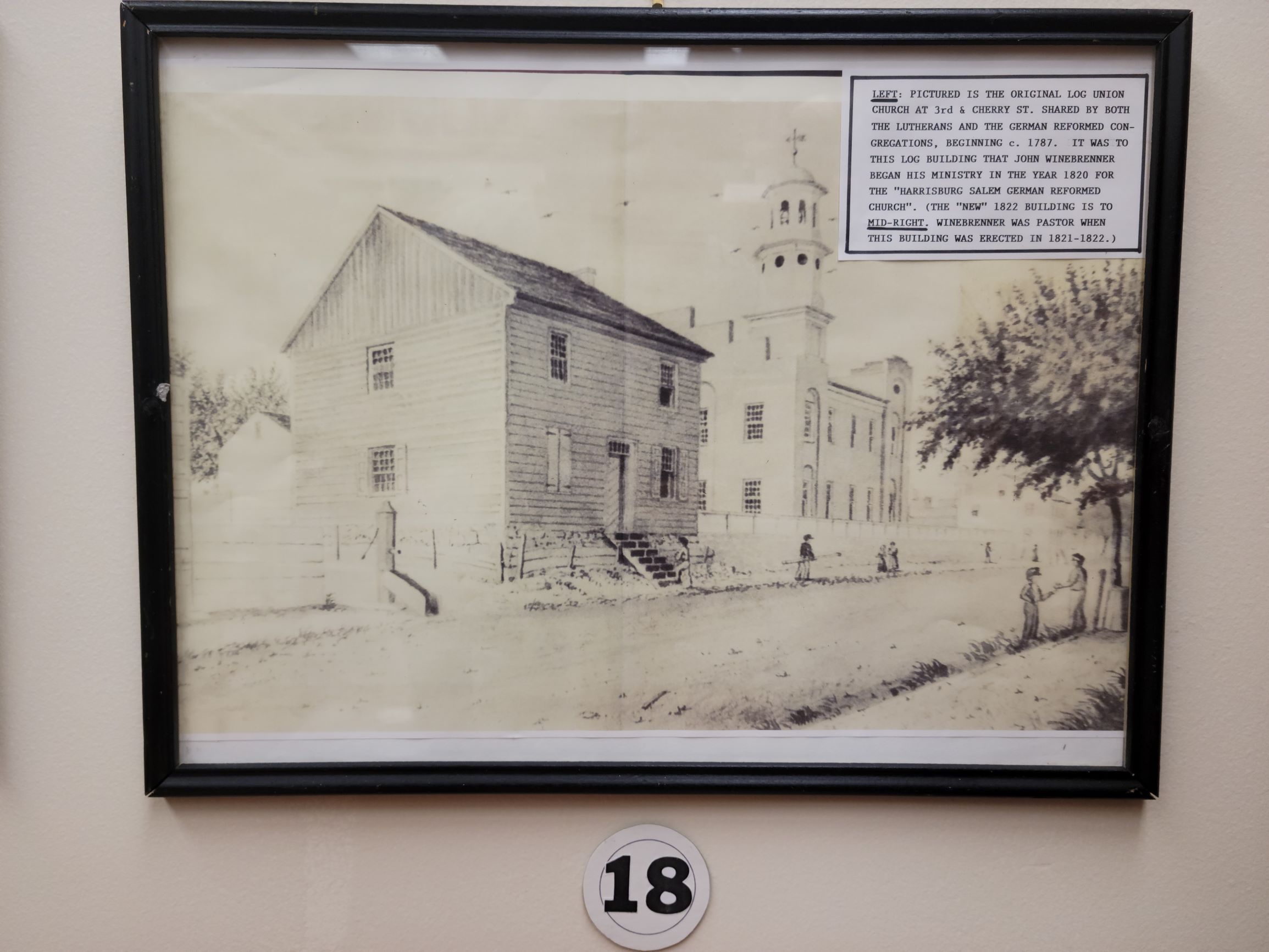 Tour Stop 18 Log Union Church John Winebrenner’s first church, log construction, in Harrisburg, Pennsylvania. Located on 3rd and Cherry Street, Winebrenner began his ministry in the year 1820. (To the right in the picture is his 2nd church he helped to lead and build).